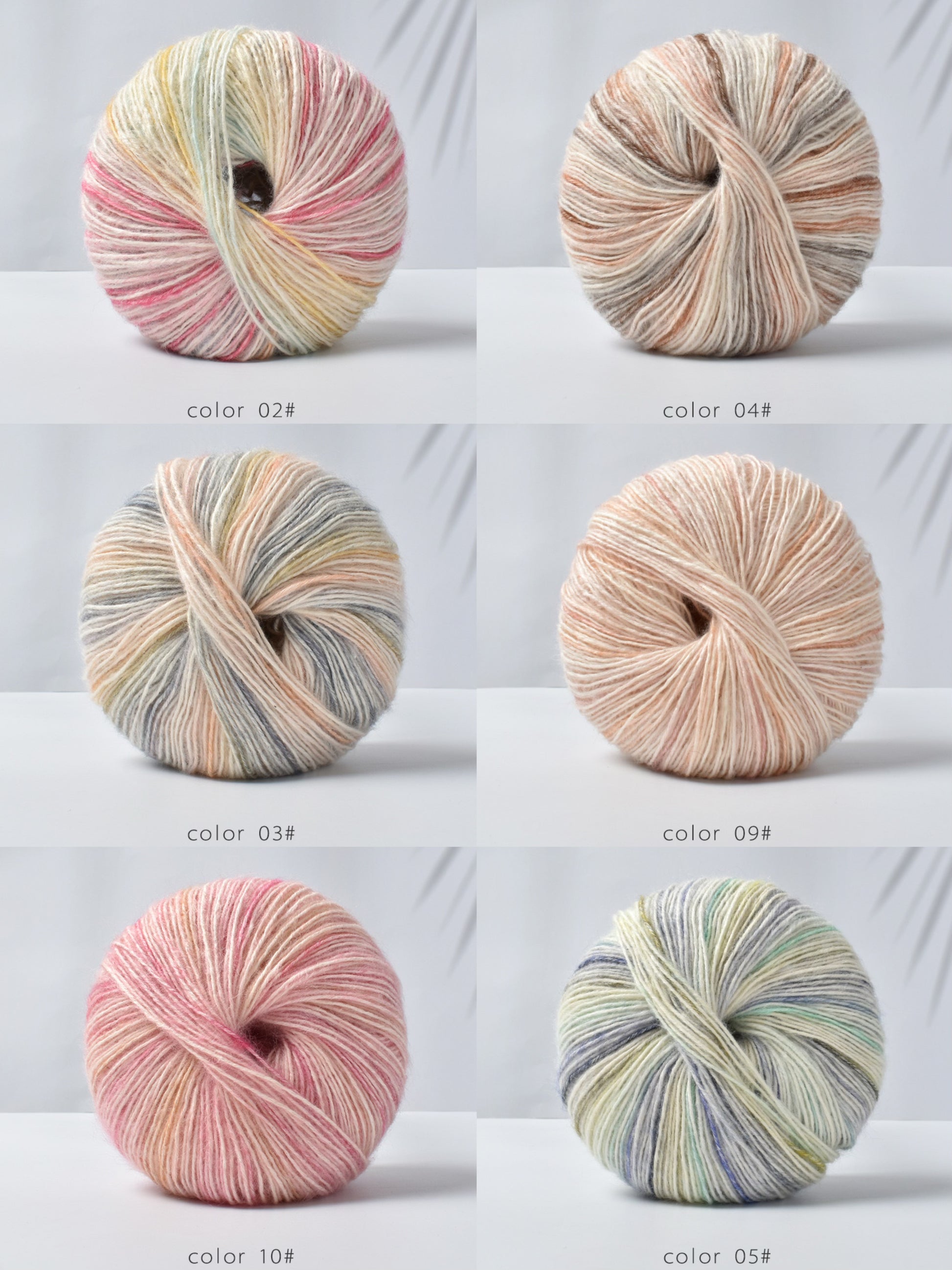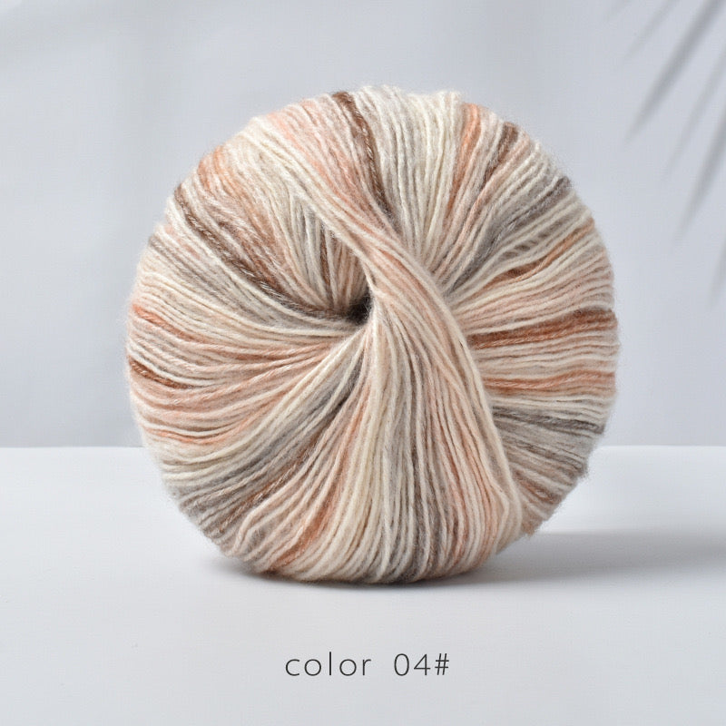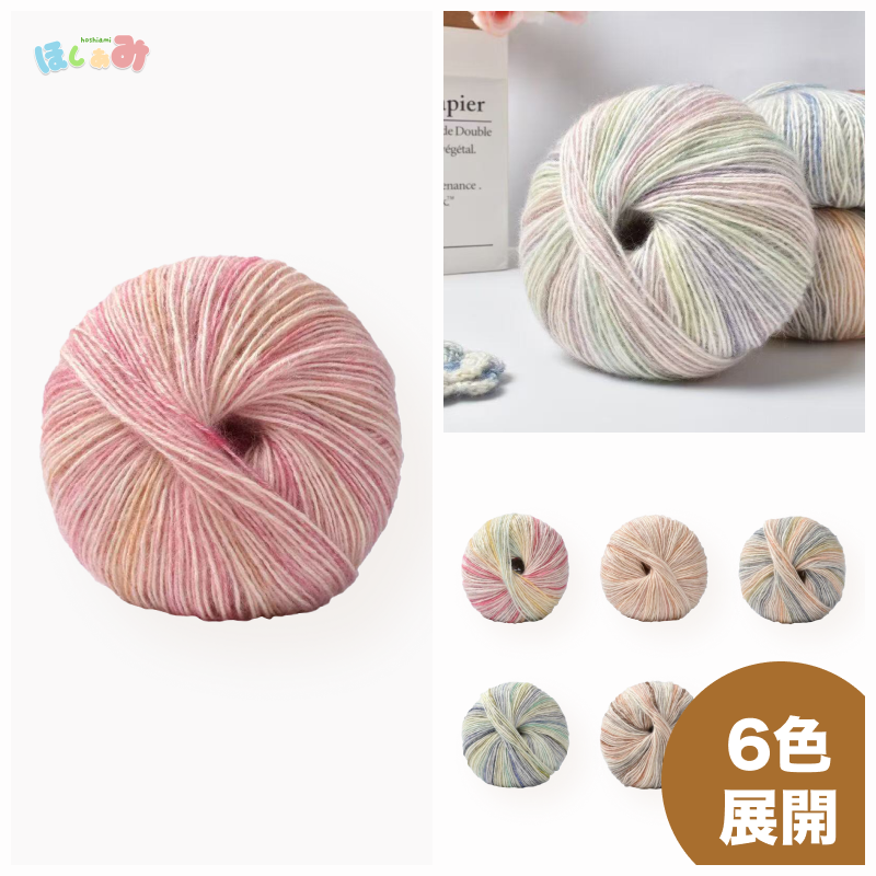 ふんわりとした手触りが心地よい、中細タイプの段染め毛糸です。
