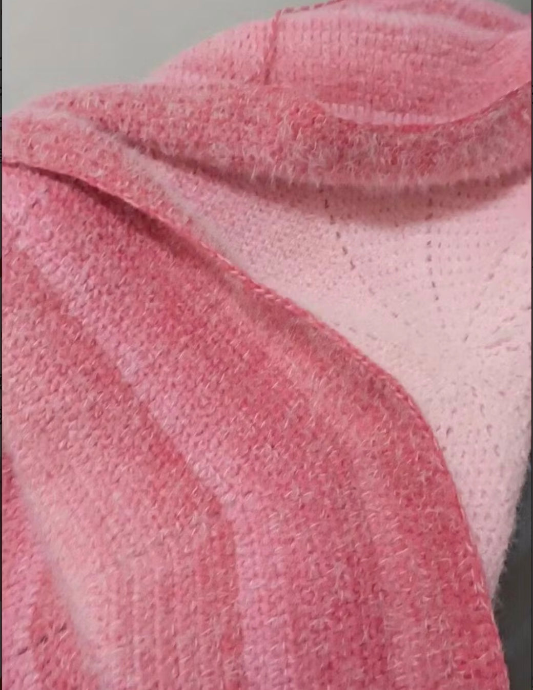 グラデーション糸は、玉をつなぐときに前の色に合わせて編み始めると自然につながります。例:1玉目を「白→ピンク」で編んだら、2玉目は「ピンクから」編み始める。