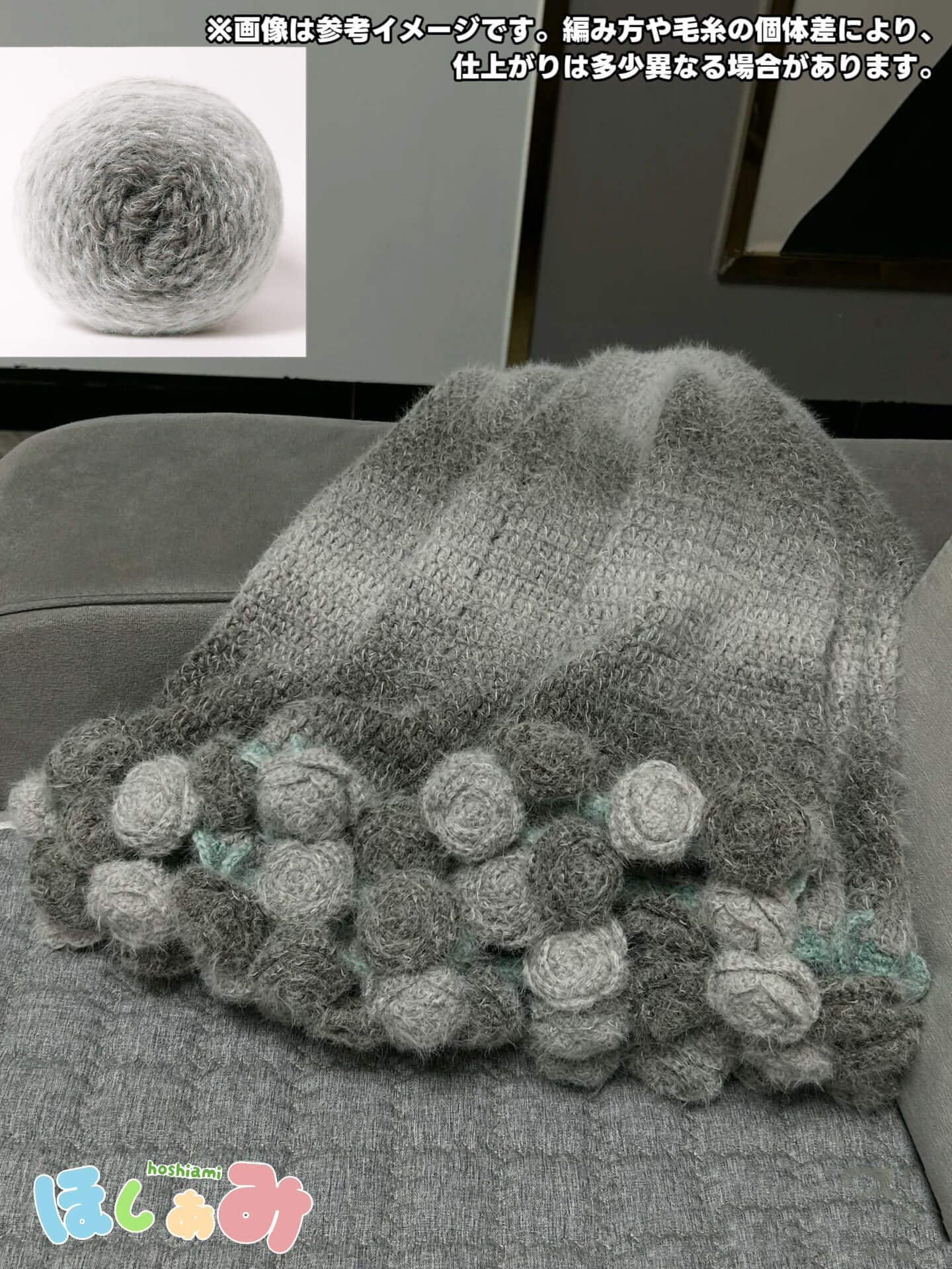 - 色の出方について: 本キットの毛糸はグラデーション糸(段染め)です。濃い色から薄い色へ変化する仕様のため、1玉ごとに色の出方が異なり、仕上がりの雰囲気も個体差が出ます。
