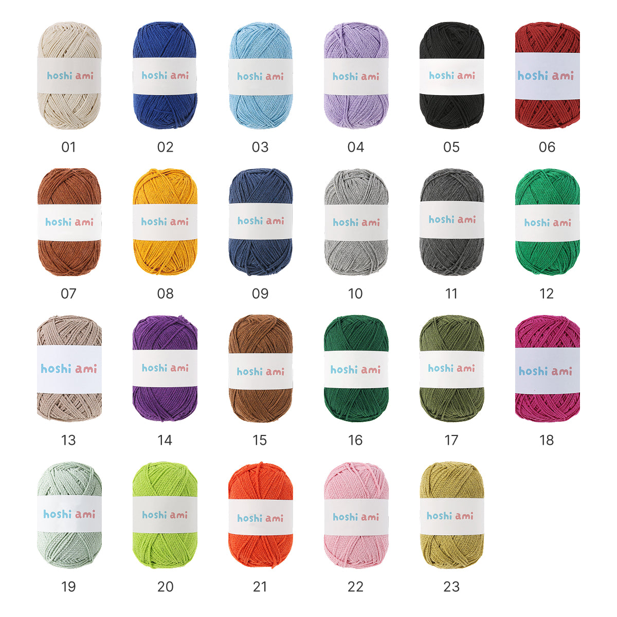 ベーシックカラーから差し色までそろった全23色展開。単色使いはもちろん、配色やモチーフ編みにもおすすめです。作品の雰囲気に合わせて色選びを楽しめます。