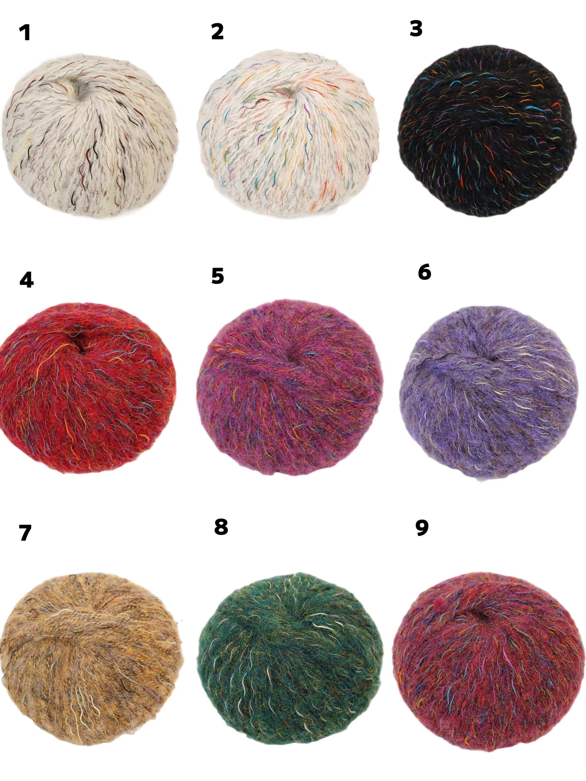 柔らかく肌触りの良いアルパカ糸で、編み心地も快適です。花火のように鮮やかな色糸が引き揃えられており、単色糸では出せない特別な彩りを楽しめます。小物やウェア、マフラーなどに編むと独特の表情が生まれ、個性を演出できます。