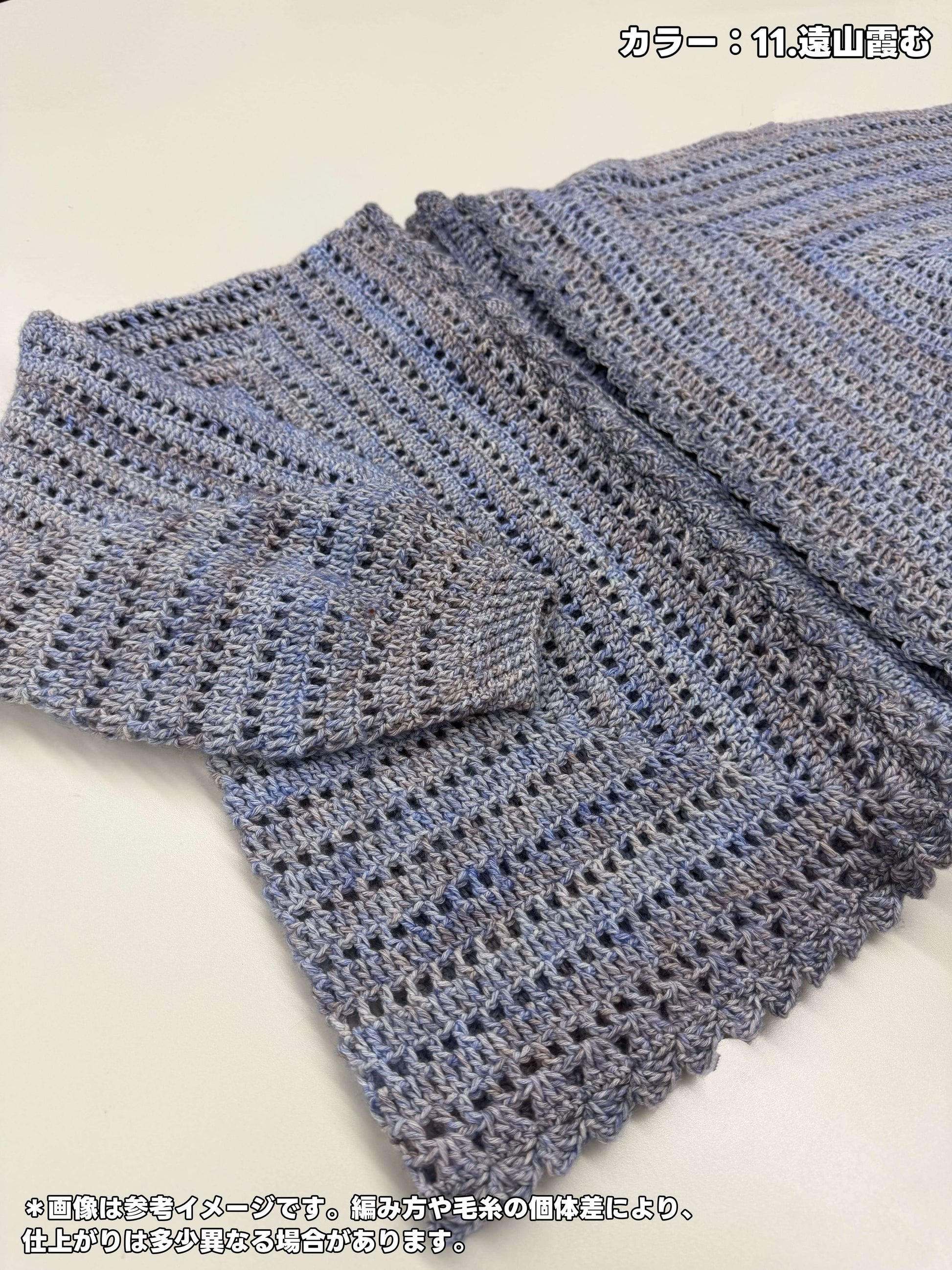 ✨ 「絵画のような毛糸」で、テクニックいらずの美しさ キットに使用するのは、1玉150gの大容量「ミックスカラー・リリヤーン」。 単色ではなく、繊細な色が混ざり合った「絵画のような色彩」が特徴です。ただ編み進めるだけで、複雑な模様編みをしたような奥行きのある表情が生まれます。