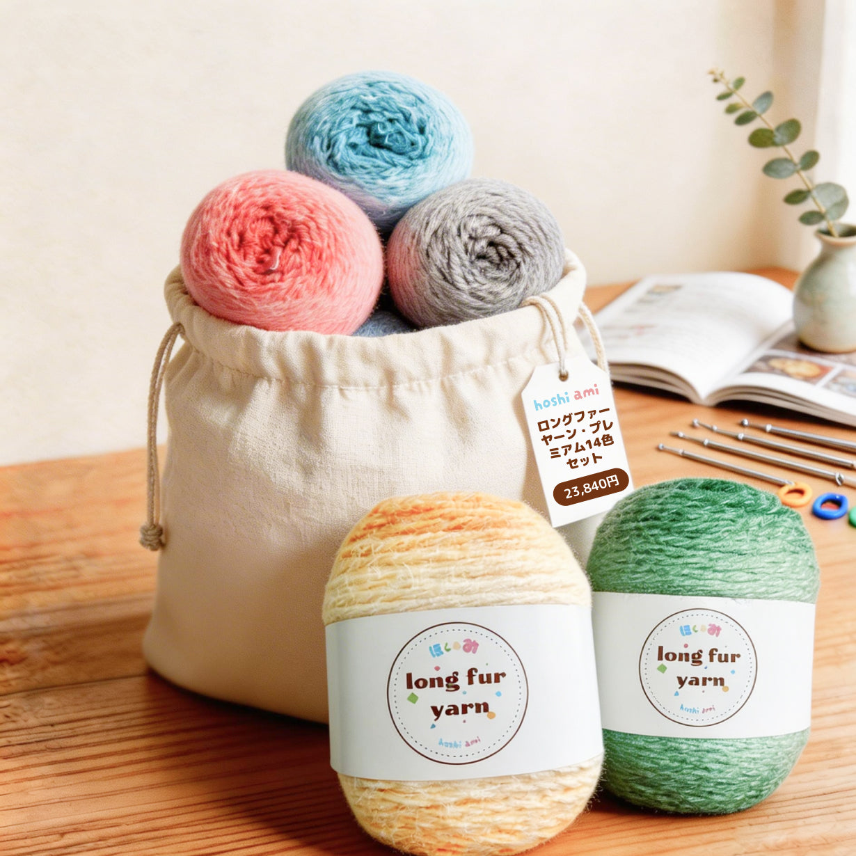 そんなお客様の声にお応えして、hoshiamiで不動の人気を誇るロングファーヤーン全14色を一度に揃えられる、贅沢なコンプリートセットをご用意しました。