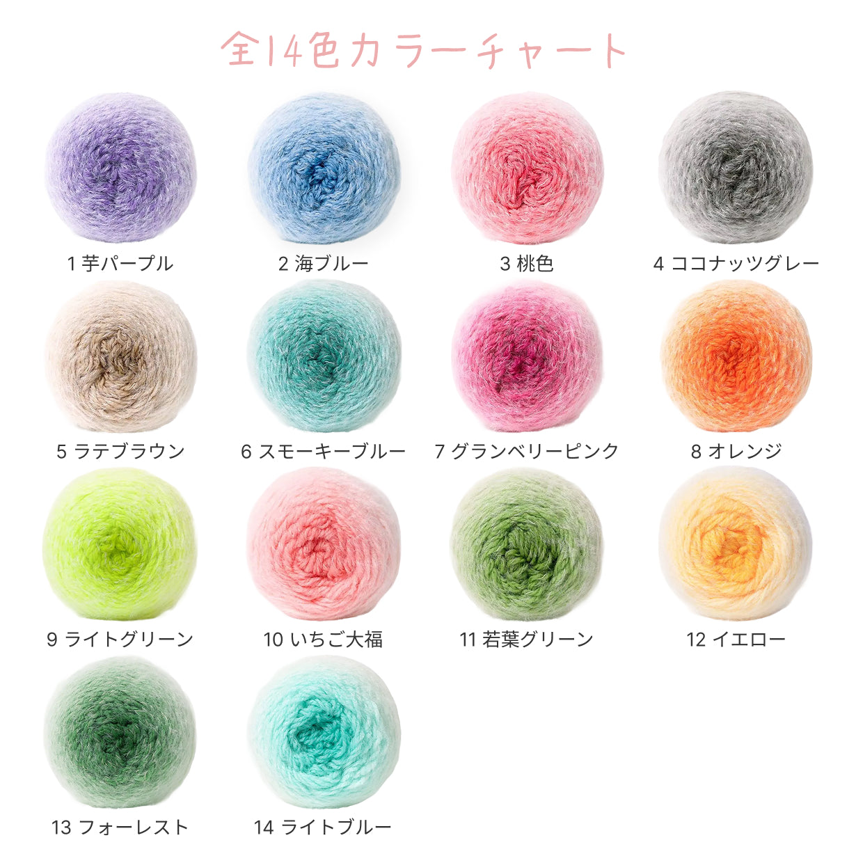編むだけで自然と美しい模様が生まれる、魔法のようなグラデーション。全14色すべてが異なる表情を持っています。次はどの色で編もうかなと悩む時間さえも、至福のひとときになります。