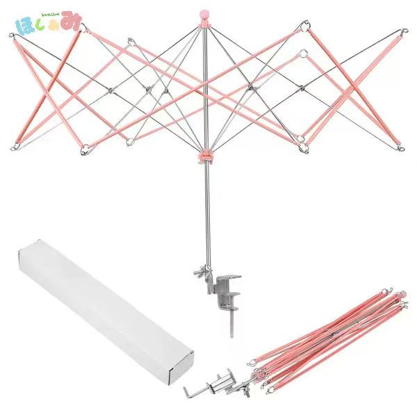 傘のように広がるフレームがかせ糸をしっかりとホールドし、編み物の準備を効率よくサポートします。