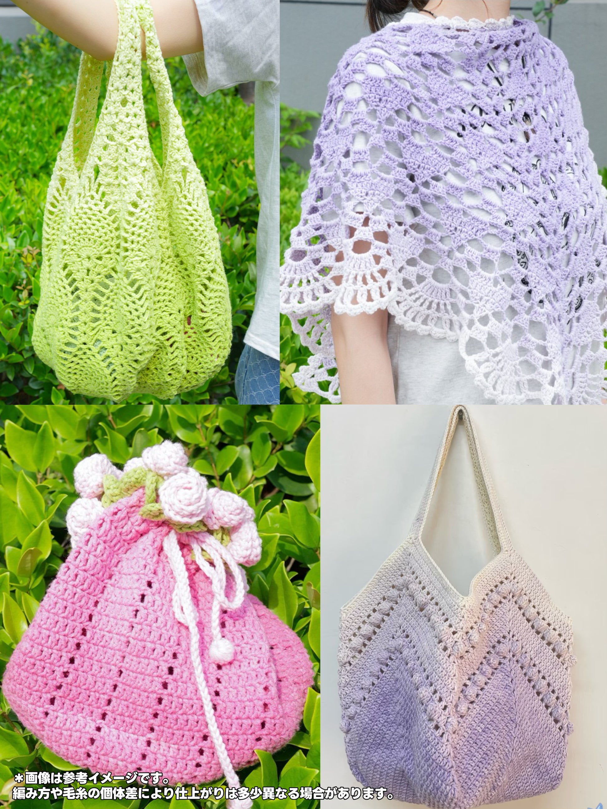 - 主な用途: ベスト、ショール、カーディガン、マフラー、ブランケット、バッグ